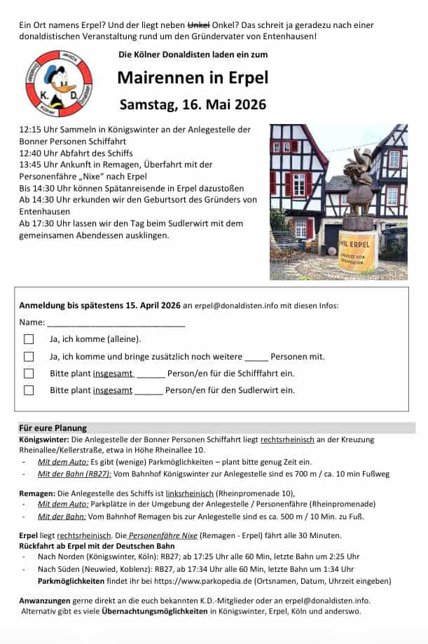 In der Facebook-Gruppe "Donaldisten" gab es heute ein Posting zum Mairennen 2026 in einem Ort mit dem schönen Namen Erpel: