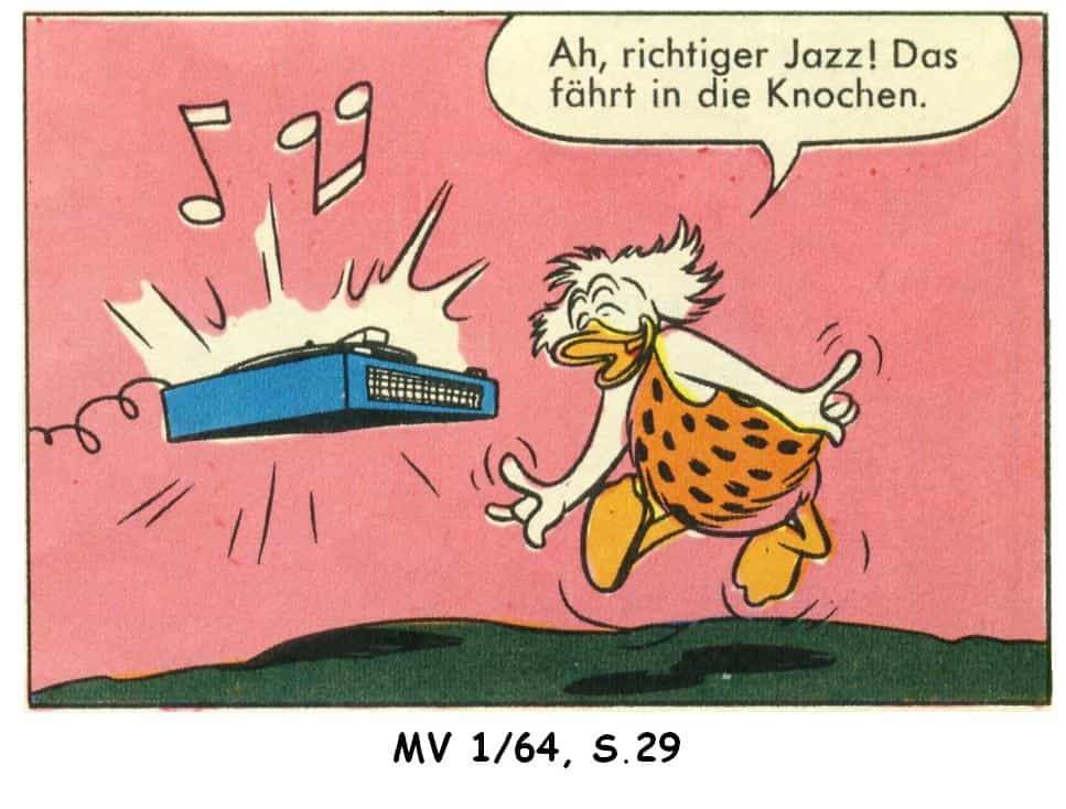 > Ich bin ziemlich sicher, daß es so ein Bild gar nicht gibt. Anglizismen wie "Jazz" wurden bis in die 60er Jahre in der MM strikt vermieden. Also, Barks war das nicht. Barks ist unsere Kernkompetenz. Aber ansonsten ist mir das Phantom etwas zu kategorisch. "the Rolling Bones" von 1966 https://inducks.org/story.php?c=S+66104 war das kein Anglizismus? Und es gab ja nicht nur MM, MV, TGDD und LT. Es gab Ansichtskarten, Kaugummibilder mit deutschem Text,
